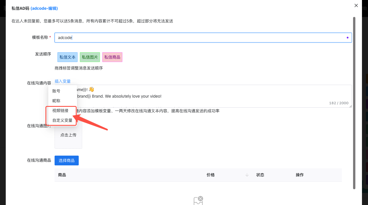 在【插入变量】,我们新增了两个模块【视频链接】【自定义变量】可以与您与达人的沟通话术配合使用