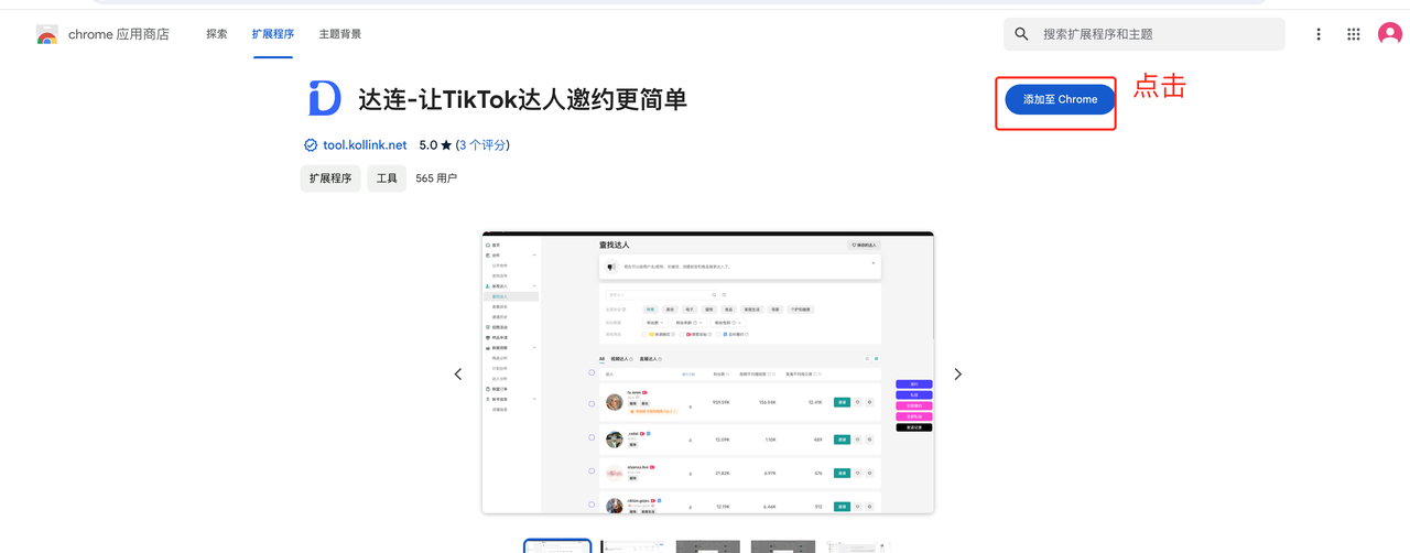 步骤一:打开谷歌浏览器,输入网址:https://chromewebstore.google.com/detail/%E8%BE%BE%E8%BF%9E-%E8%AE%A9tiktok%E8%BE%BE%E4%BA%BA%E9%82%80%E7%BA%A6%E6%9B%B4%E7%AE%80%E5%8D%95/acnbdmcfjdpojblohmiggmenhofldghk?hl=zh-CN&utm_source=ext_sidebar